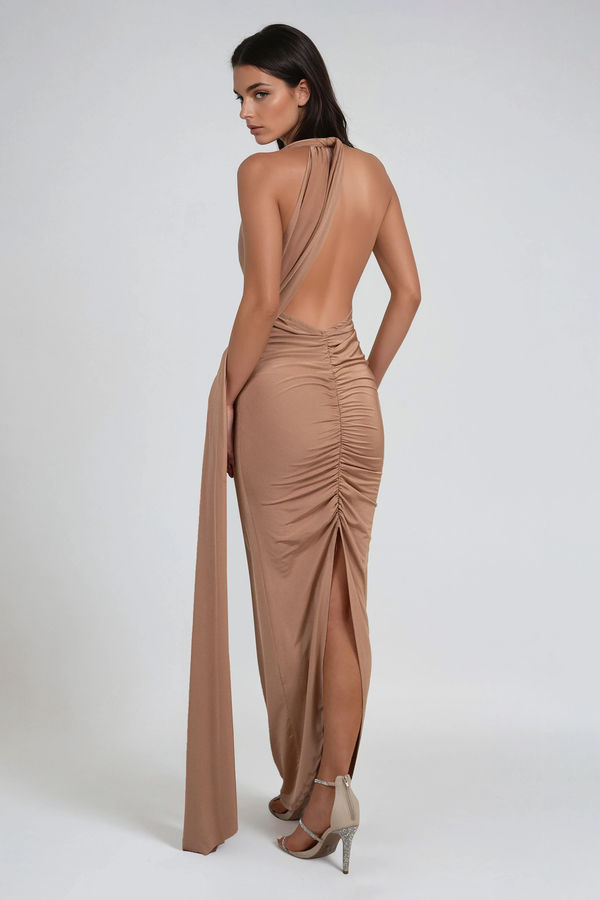 Effortlessly sexy, endlessly versatile. The Skinny Dipping Ruched Multiway Maxi Dress Macchiato redefines the going-out look, this sultry number features a plunging neckline, dramatic open back, and ultra-flattering ruching that hugs in all the right places. With adjustable wrap ties for endless styling, it’s the definition of versatile glam. Whether tied up or left to drape, this maxi does the most with minimal effort.