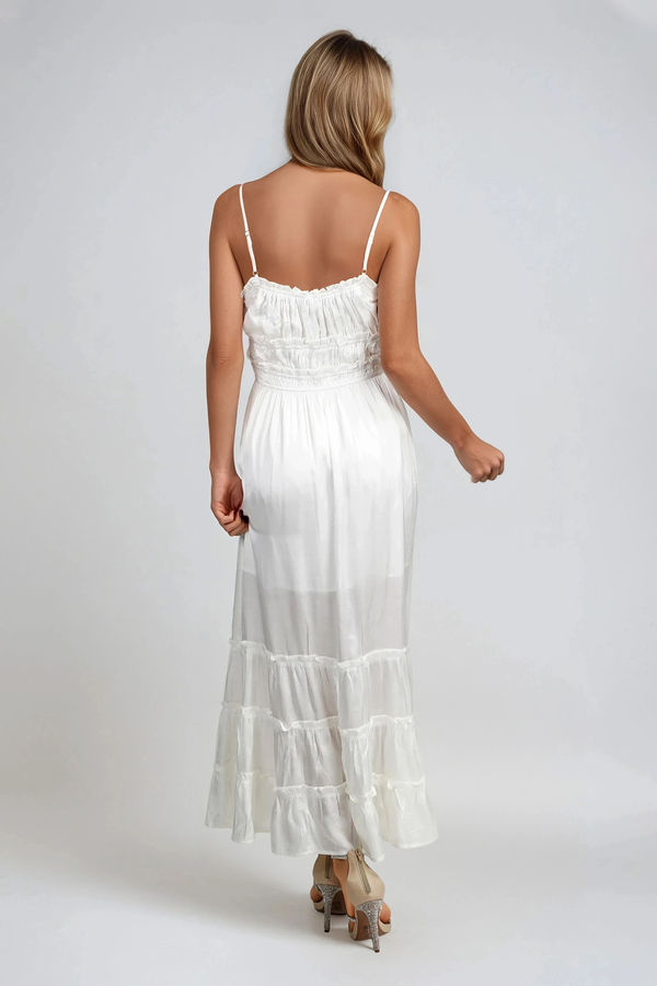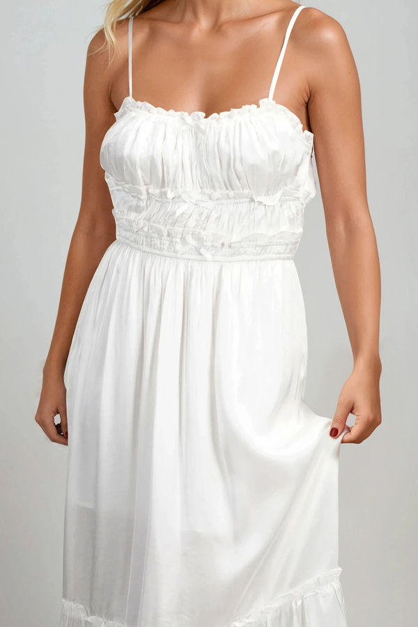 Shine like your most radiant self in the Supernova Satin Tiered Maxi Dress White. With a luxe satin-touch finish, romantic tiered skirt, and a delicate bow detail at the bust, this dreamy silhouette is made to float with you from golden hour strolls to candlelit dinners. The elastic waist adds all-day comfort without sacrificing shape. Effortless, elegant, and absolutely stellar.