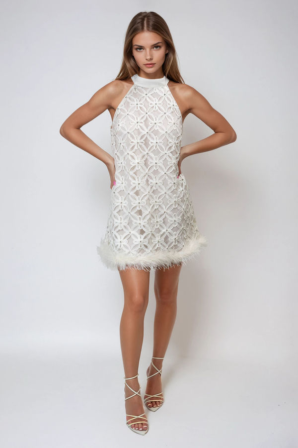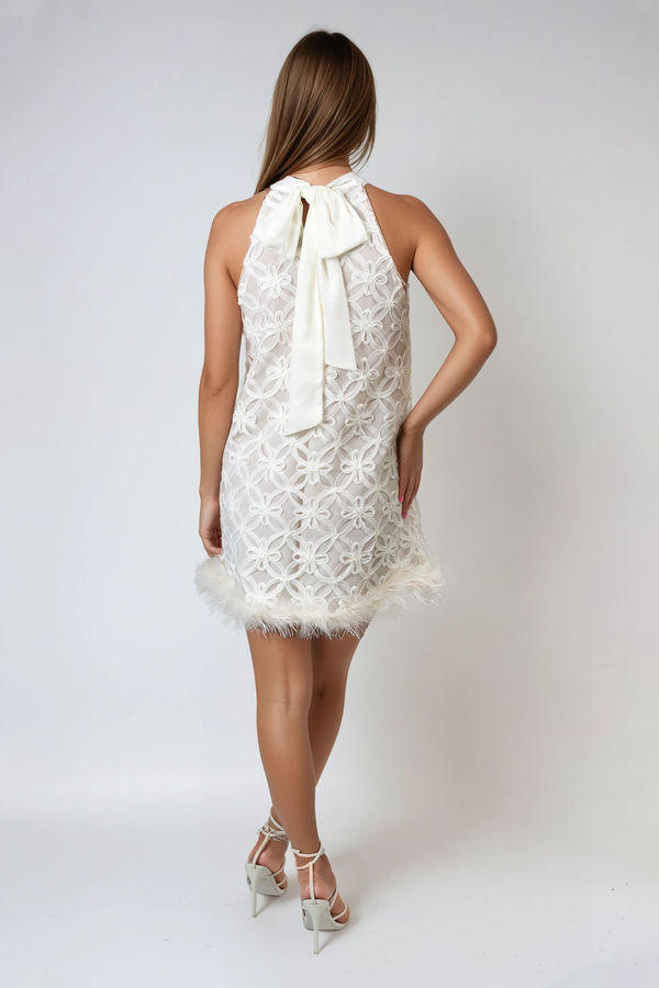 Float through the moment in the Heaven Sent Lace Feather Mini Dress Off White. Featuring dreamy floral lace, a soft feather-trimmed hem, and a romantic ribbon-tie back, this halter mini is made for bridal showers, engagement parties, or any RSVP that calls for a little extra magic. Flirty, elegant, and effortlessly angelic—just add heels and let the compliments roll in.