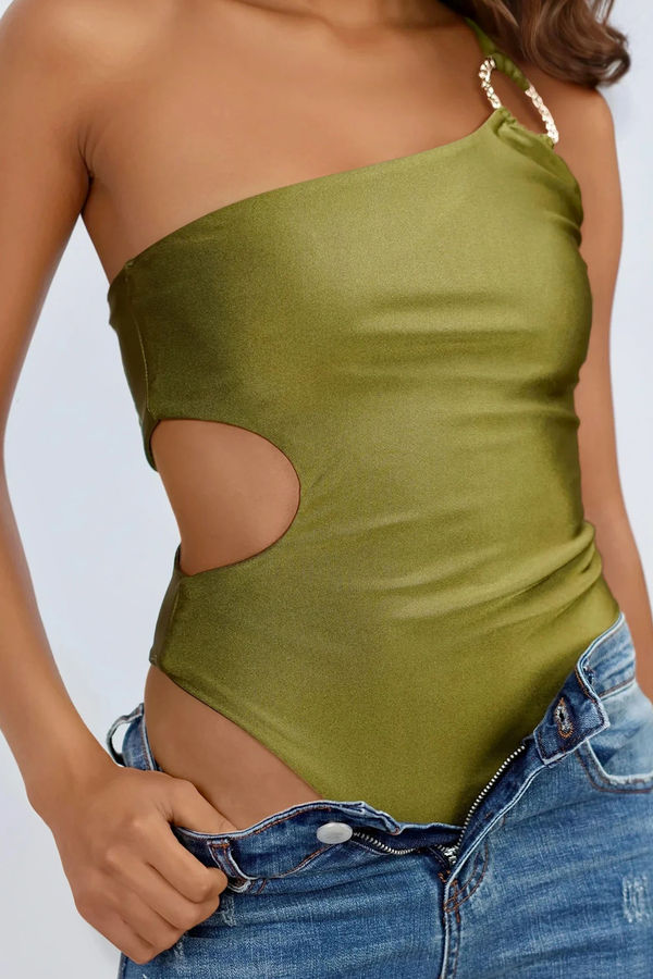 Turn heads in the Daring in Silk One Shoulder Bodysuit in Dark Olive. Featuring a sleek one-shoulder design with a bold shoulder ring detail and sultry side cutout, this thong-back bodysuit is all about effortless allure. The silky finish hugs your curves while the daring cut brings instant glam. Perfect for pairing with high-waisted jeans or a chic mini, this statement piece is made for nights when standing out is the only option.
