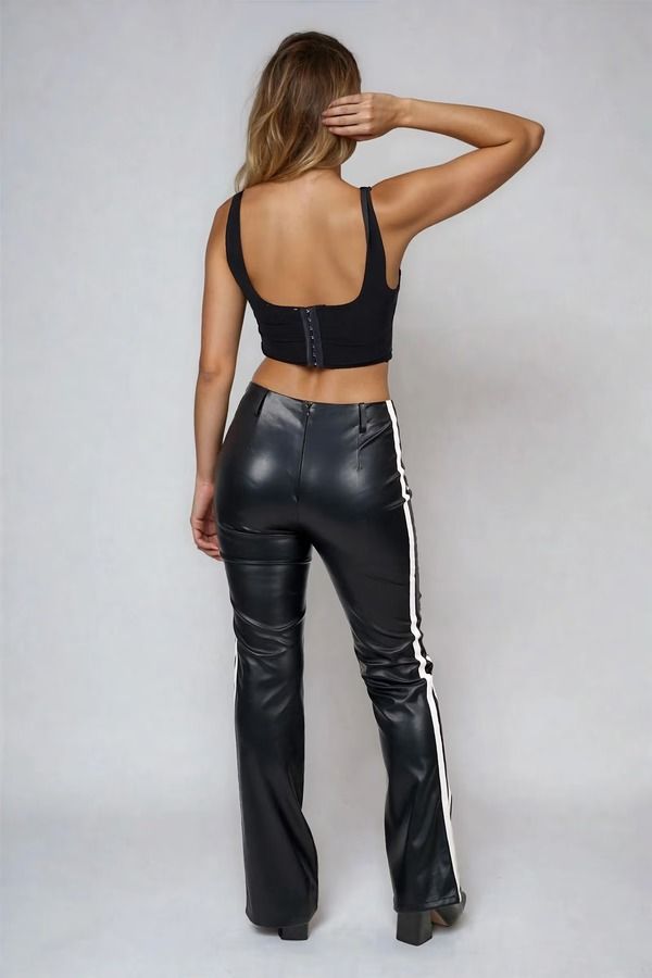 Rebel Line Faux Leather Pants in Black/Cream bring bold attitude with a sleek edge. Designed with a high-rise fit and contrast side stripes, these pants elongate your legs while serving major street-style energy. The faux leather finish adds luxe shine, making them perfect for nights out or statement daytime looks. Pair with heels for a daring vibe or sneakers for casual cool—these pants are built to stand out.