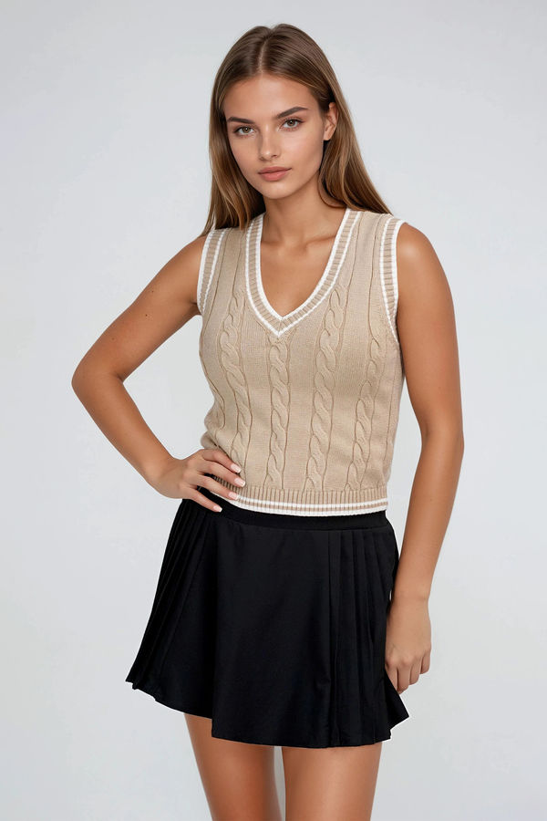Bring a playful twist to your everyday looks with the Classic Twist Cable Knit Tank Top in Khaki. Featuring a flattering V-neckline, soft cable knit texture, and a sleeveless cut trimmed with contrast edges, this tank is equal parts chic and comfy. Perfect for layering or rocking solo, it’s the versatile piece your closet has been craving. From coffee runs to weekend hangs, this knit keeps you effortlessly on trend.