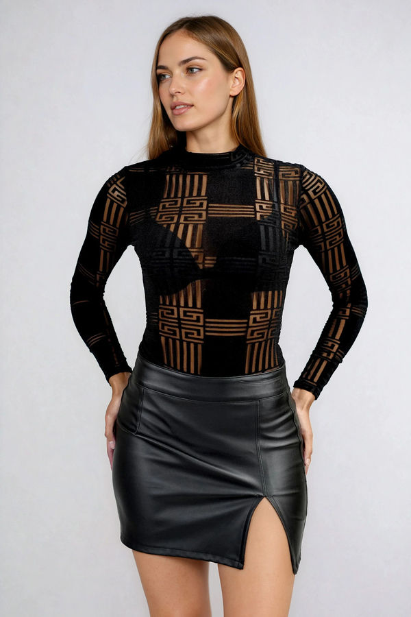 Bring the drama with the Midnight Maze Sheer Bodysuit in Black. Featuring a daring geometric mesh design, long sleeves, and a sleek high neckline, this piece delivers the perfect mix of edgy and chic. Whether paired with a leather skirt or high-rise pants, it’s made to stand out. Bold, confident, and undeniably sexy—this bodysuit is your ticket to unforgettable style.