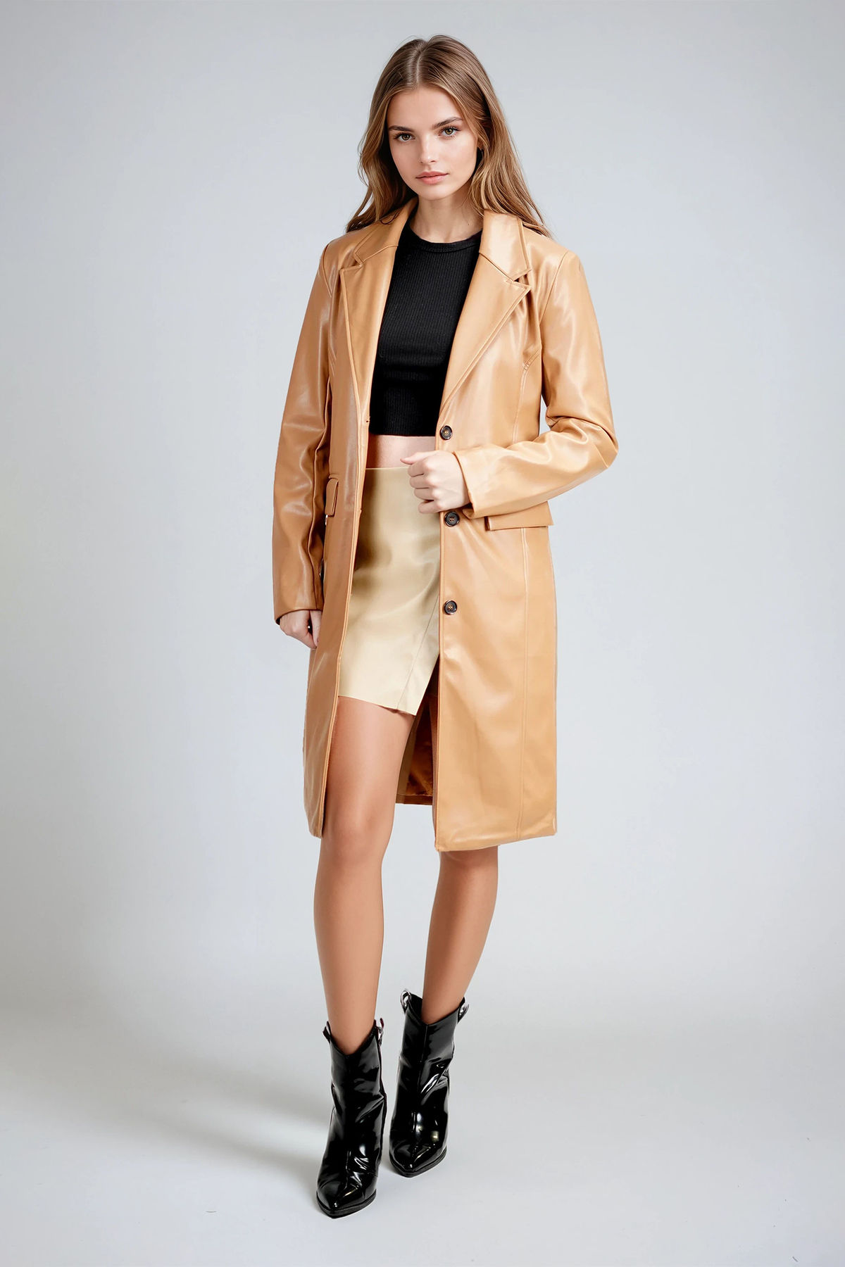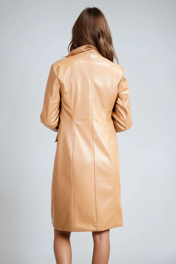 Make your mark with the Executive Edge Faux Leather Longline Coat in Camel, crafted from luxe leather with a sleek tailored finish. Its sharp lapels and longline silhouette bring instant sophistication, while the structured fit adds modern polish. Perfect for power meetings, dinner dates, or elevating your street style, this coat is the ultimate wardrobe staple for when you want to exude confidence with ease.