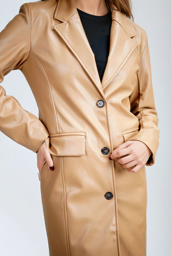 Executive Edge Faux Leather Longline Coat - Camel
