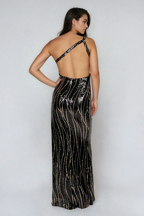 Celestial Shine One Shoulder Metallic Maxi Dress - Black/Gold