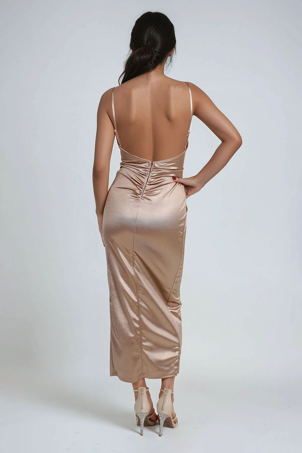 Opulent Aura Satin Slit Midi Dress - Mocha Mousse
