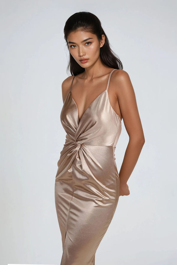 Luxe vibes only in Opulent Aura Satin Slit Midi Dress in Mocha Mousse. Featuring a plunging neckline, twisted front detail, and a sleek thigh-high slit, this satin stunner is designed to highlight your curves with effortless sophistication. Adjustable straps and a sultry open back add the perfect finishing touches, making it your go-to look for weddings, cocktail hours, or any night that calls for luxe glamour.