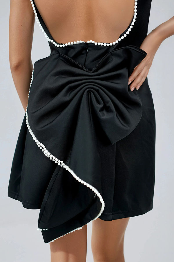 Step into the spotlight with the Luxe Grace Open Bow Mini Dress in Black, a chic showstopper designed with a pearl-trim neckline, daring open back, and statement bow detail. Its sleek silhouette strikes the perfect balance of elegance and charm, making it your go-to for cocktail parties, romantic dinners, or holiday celebrations. Effortlessly glamorous, this mini is all about turning special moments into unforgettable memories.