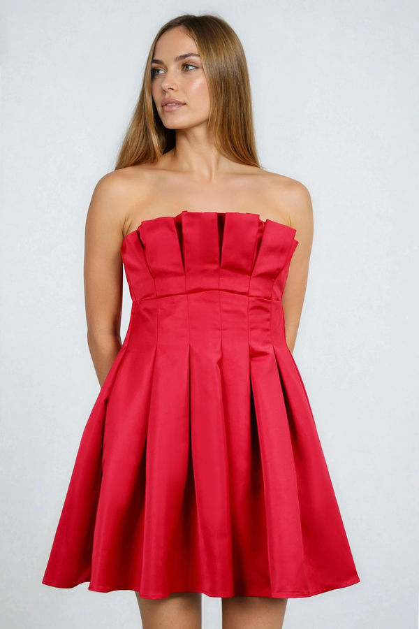 Turn heads with the Glam Charm Strapless Pleated Mini Dress in Wine, featuring a flirty ruffle neckline, structured bodice, and twirl-worthy pleated skirt. Its strapless design adds a daring touch, while hidden pockets keep it playful and practical. Perfect for cocktail hours, holiday parties, or date nights, this mini is your go-to for striking the perfect balance of elegance and fun in every moment.