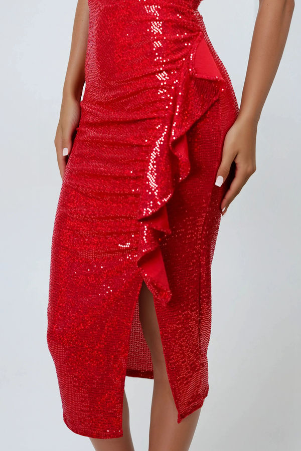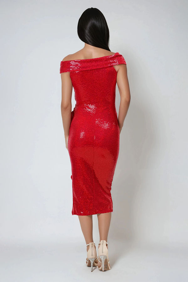 Oh So Extra Off Shoulder Sequin Midi Dress - Red