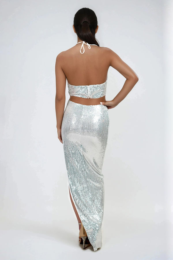 Get ready to shine in our Bring the Heat Cutout Sequin Maxi Dress in Silver This dazzling single-piece gown creates the illusion of a two-piece set, featuring a halter neckline and a sexy O-ring cutout that connects the bodice and high-waisted skirt. With its all-over shimmer and ultra-high leg slit, it’s the ultimate head-turner for a summer gala, a Vegas party, or any night you plan on dominating the dance floor.
