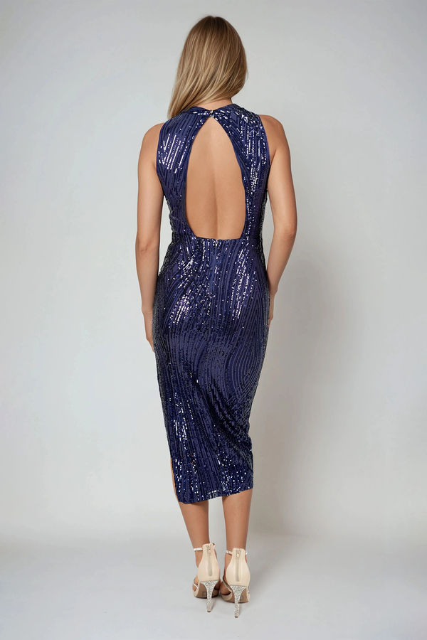 Happy Hour Open Back Sequin Midi Dress - Navy