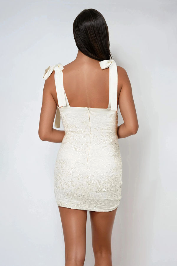 Level up your party wardrobe with the Shine On Lace Up Sequin Mni Dress in Cream! This dazzling dress features adjustable tie-shoulder straps and a sexy lace-up front, guaranteeing you'll sparkle from every angle. It's the ultimate showstopper for bachelorette parties, birthdays, or any night you want to be the main event. Get ready to shine!