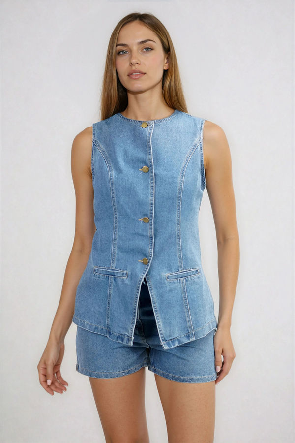 Denim, but make it boss. The Dream in Denim Vest Top and Short Set in Blue brings sharp tailoring to your off-duty look. With structured seams, gold button accents, and a flattering fitted silhouette, this matching vest-and-shorts combo is effortlessly chic. Perfect for brunch, city strolls, or rooftop dates — just add white heels and statement earrings for that model-off-duty finish.
