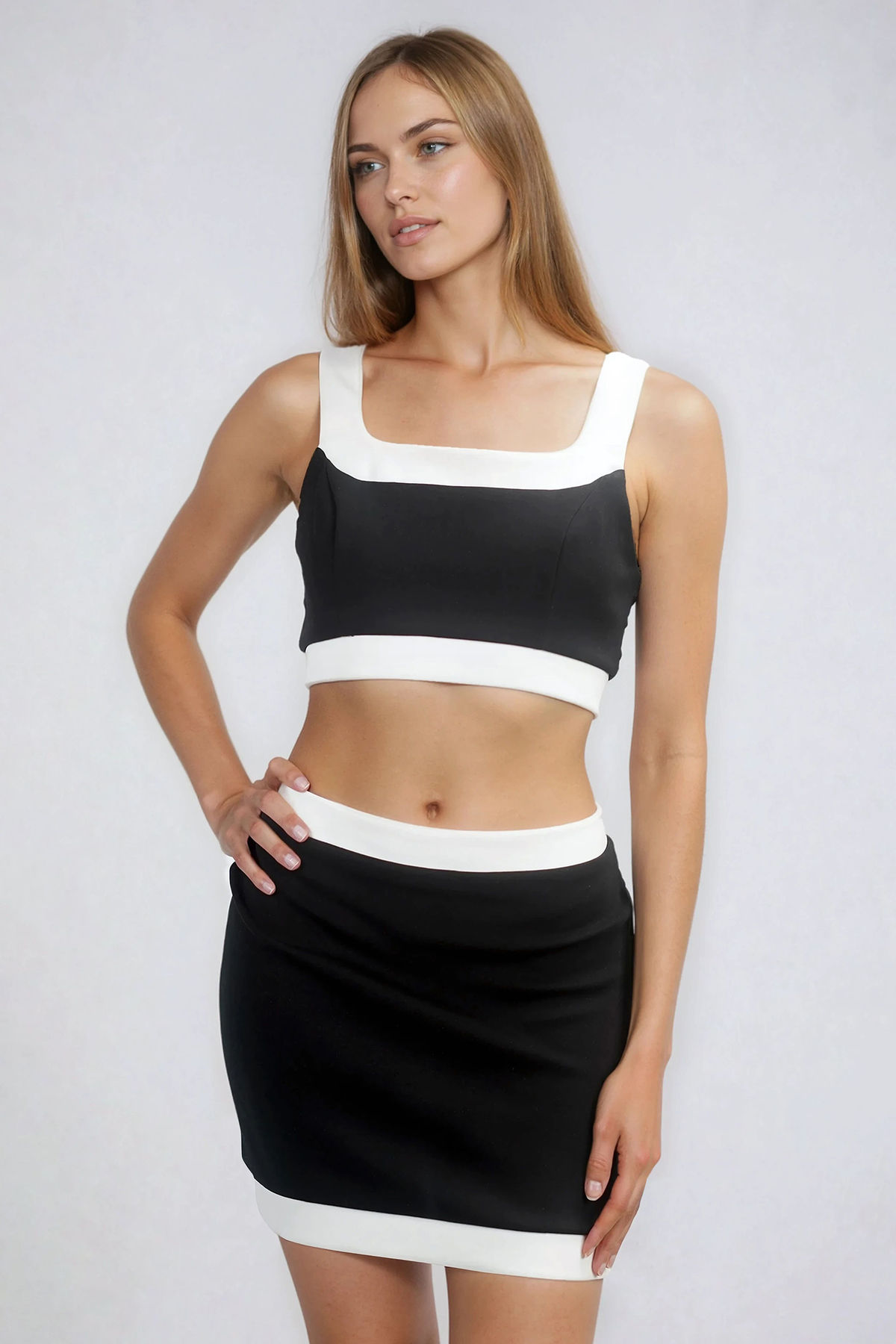 Street Siren Square Neck Crop Top and Mini Skirt Set - Black/White