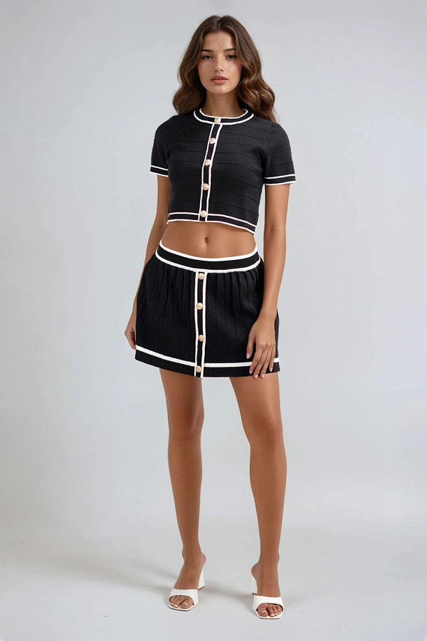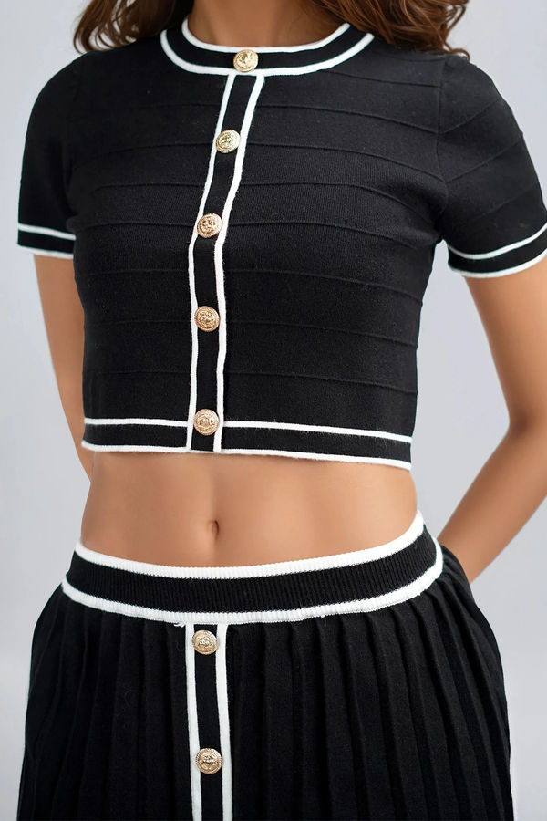 Step out with confidence in the Turn Heads Sweater Crop Top in Black/White — a chic blend of preppy and playful made for brunch dates and nights out. Featuring gold button details, contrast white trim, and a flattering cropped fit, this knit elevates your look with minimal effort. Pair it with the Turn Heads Sweater Skirt Set for a matching moment that’s effortlessly polished and totally unforgettable.