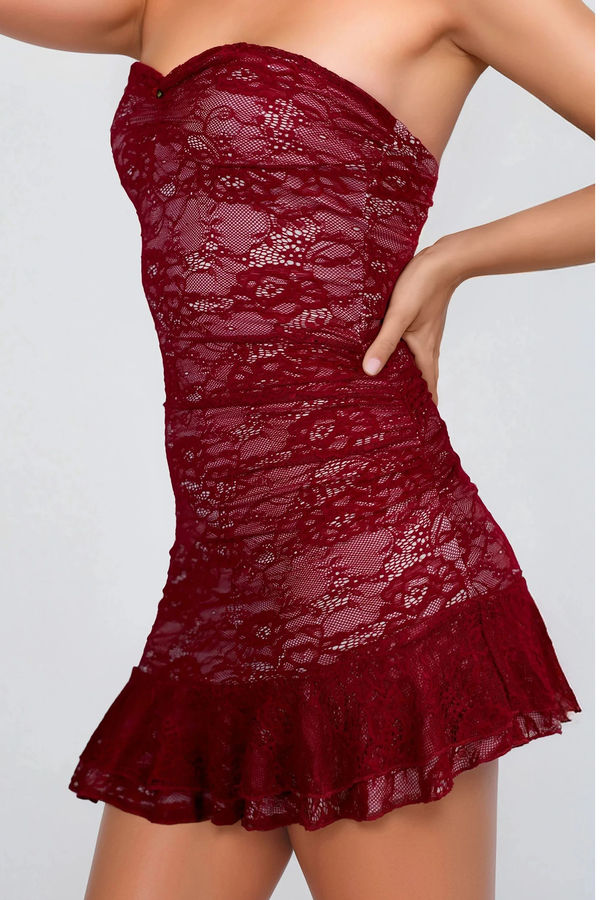 Make a statement in the Sweet Sin Lace Bustier Mini Dress in Red. This strapless lace mini highlights your curves with its romantic silhouette and sultry ruched detailing. The flirty short skirt makes it perfect for a night out, a hot date, or a fun party. With its elegant lace and body-hugging fit, this dress turns heads. Pair it with a choker and strappy heels for an edgy, feminine look that steals the spotlight.