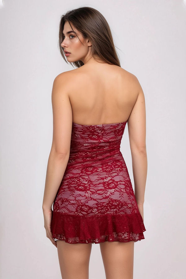Make a statement in the Sweet Sin Lace Bustier Mini Dress in Red. This strapless lace mini highlights your curves with its romantic silhouette and sultry ruched detailing. The flirty short skirt makes it perfect for a night out, a hot date, or a fun party. With its elegant lace and body-hugging fit, this dress turns heads. Pair it with a choker and strappy heels for an edgy, feminine look that steals the spotlight.