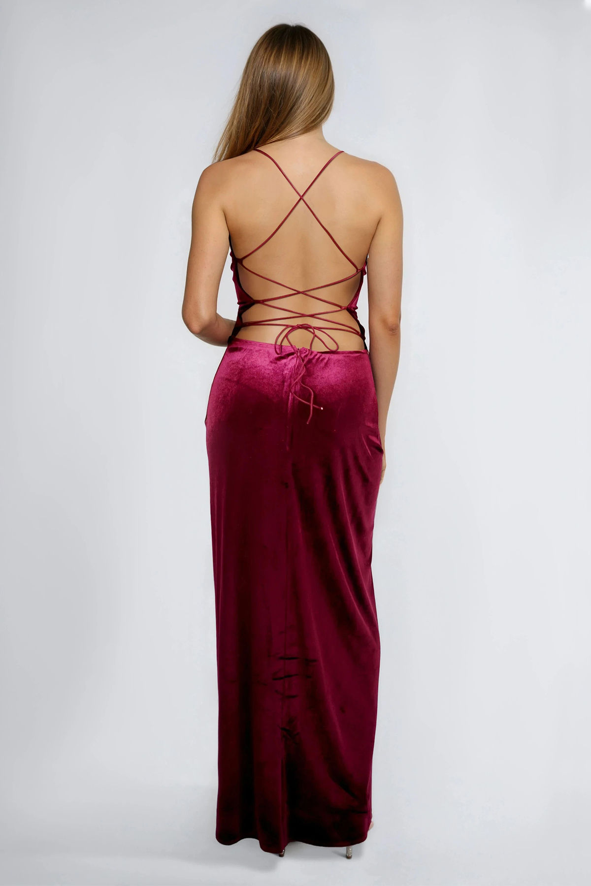 Moonlit Muse Velvet Slit Maxi Dress - Wine