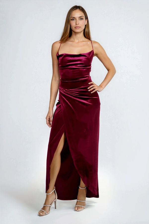 Step into pure elegance with the Moonlit Muse Velvet Slit Maxi Dress in Wine. Featuring a sultry thigh-high slit and a delicate criss-cross back, this dress blends sophistication with allure. The form-fitting bodice accentuates your silhouette, while the flowing skirt adds dramatic movement—perfect for formal events, evening galas, or upscale cocktail parties. Finish the look with metallic heels and statement earrings for undeniable, confidence-filled glamour.