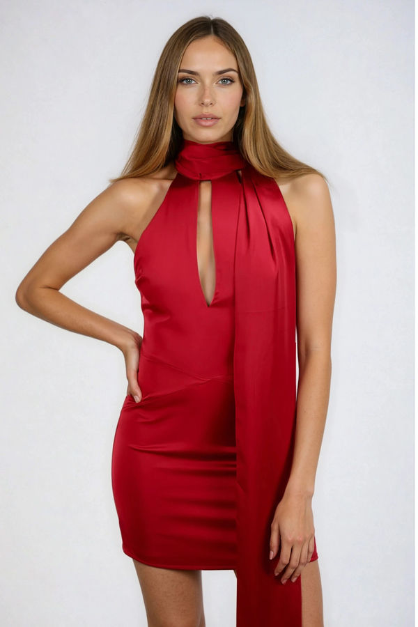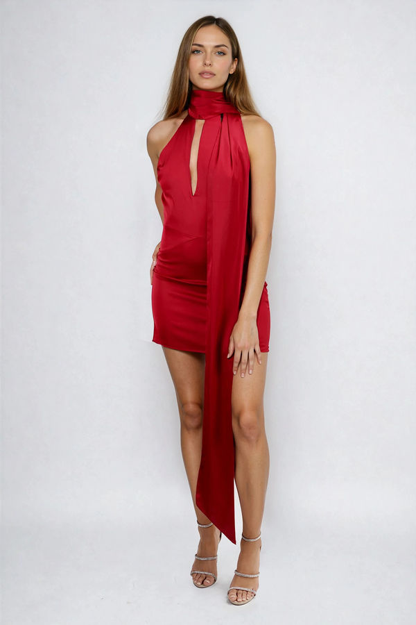 Make a bold entrance in the Dressed in Desire Satin Scarf Mini Dress in Red. This silky halter mini features a daring cut-out front, dramatic back tie, and a separate satin scarf for an extra touch of luxe. The sleek silhouette and flowing fabric add irresistible glamour, making it perfect for upscale parties, evening events, or a night out. Pair with strappy heels and minimalist jewelry for a sexy, sophisticated finish.