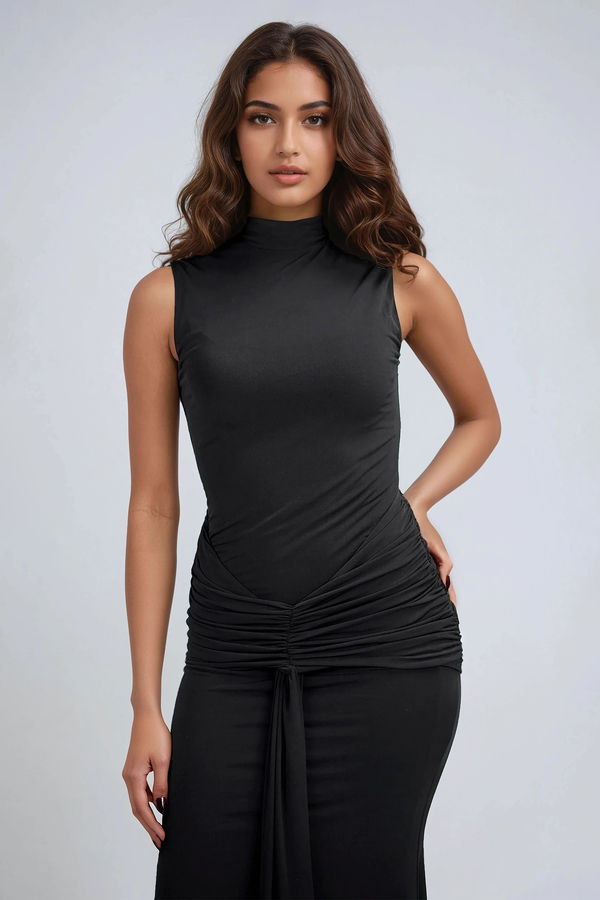 Meet the sleek showstopper made for nights when you want to look effortlessly stunning. The minimalist Confident Charm Sculpted Bodycon Maxi Dress in Black features a high neckline, a sculpting fit, and a draped knot detail that adds soft, luxe movement. Perfect for galas, evening events, or chic dinners. Style it with statement earrings, a slick ponytail, and strappy heels for a modern, runway-worthy finish.