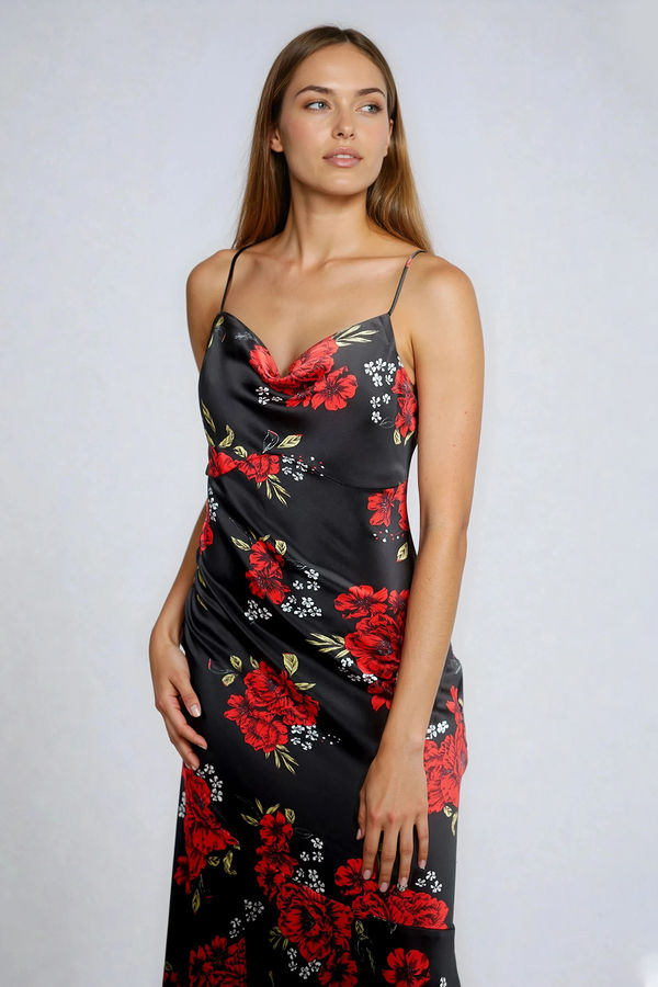 - Floral satin cowl neck maxi dress