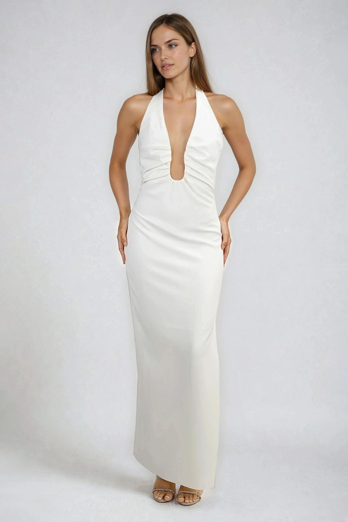 Turn heads in the Celestial Dream Halter Plunge Maxi Dress in Off White, a show-stopping white piece that combines elegance with bold allure. Its plunging neckline and figure-hugging silhouette exude confidence, while the halter neck design and side slit add just the right touch of sophistication. Perfect for a glamorous evening or an unforgettable event, this gown is all about making an entrance. Designed to fit like a glove, it’s your go-to for that effortless chic look.