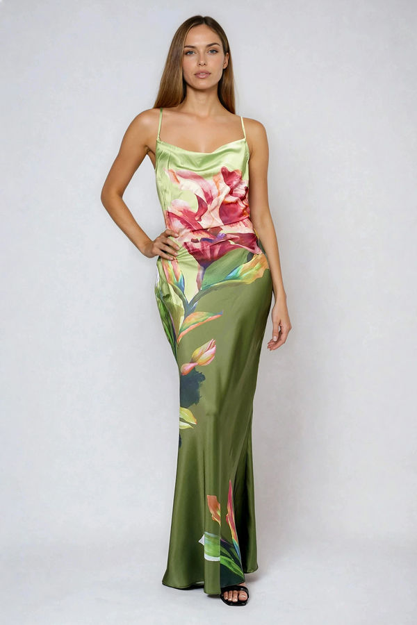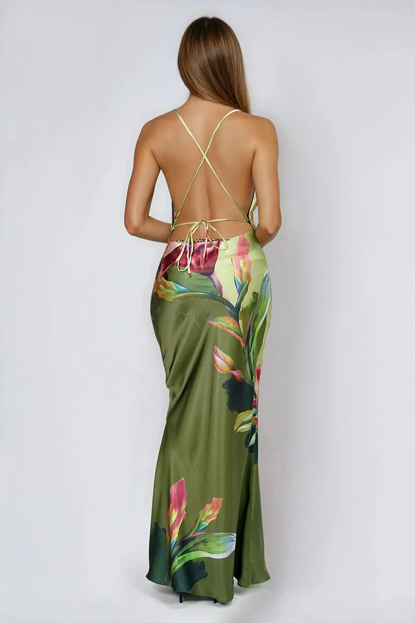 Turn every entrance into a moment in the Call Me Darling Floral Open Back Maxi Dress in Olive. This silky, body-skimming slip features adjustable spaghetti straps and a statement open back with crisscross ties for a customizable fit. Fluid satin drapes effortlessly to highlight your shape while staying comfortable. Perfect for weddings, formal events, cocktail parties, date nights, and elevated vacation dinners.