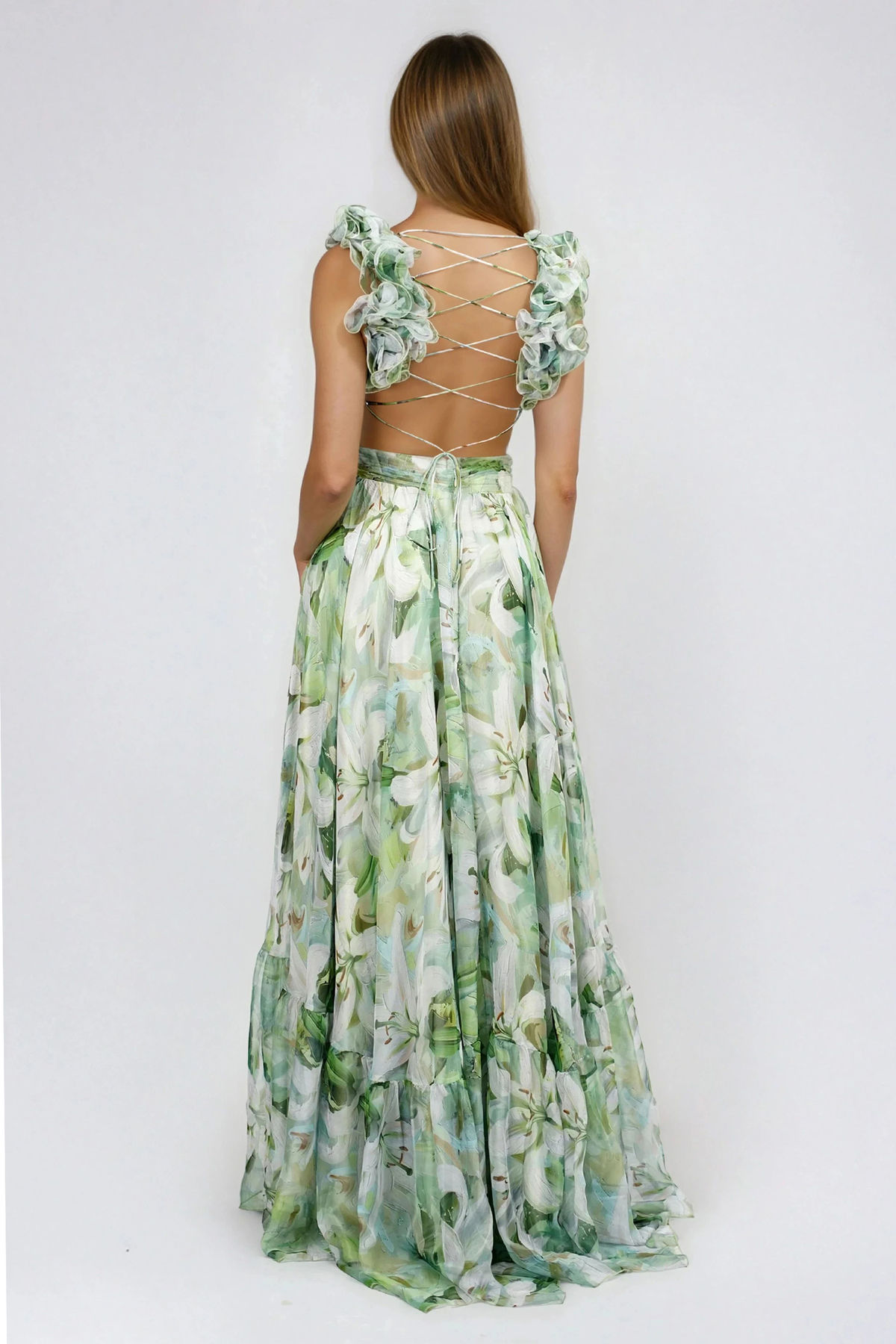 - Ruffled Lace-Up Back Floral Maxi Dress
