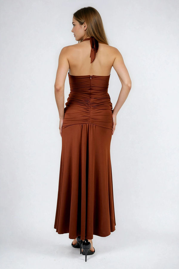Bold, sultry, and impossible to ignore, the Own the Night Plunge Bodycon Maxi Dress in Brown features a dramatic plunging neckline, figure-enhancing ruching, and a fluid draped detail that elongates the silhouette. Designed with a body-hugging fit and soft stretch fabric, it delivers confidence and comfort with statement-making appeal. Perfect for formal events, destination weddings, upscale vacations, cocktail parties, and nights out.