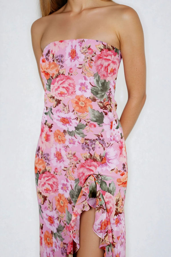 Romantic and effortlessly feminine, the Sweet Romance Strapless Ruffled Maxi Dress in Rose Lavender is made for sun-soaked days and special moments. Designed with a sleek strapless neckline and a softly structured bodice, it hugs your shape before flowing into a ruffled, high-low hem that adds movement and charm. The floral print brings a fresh spring feel, making it perfect for date nights, garden parties, weddings, vacations, or any occasion that calls for an easy, elegant statement.