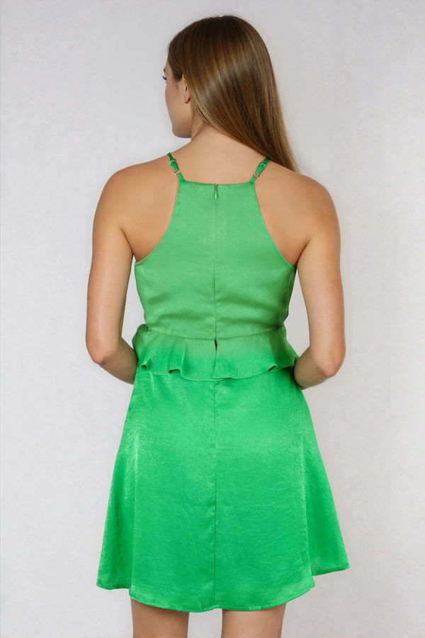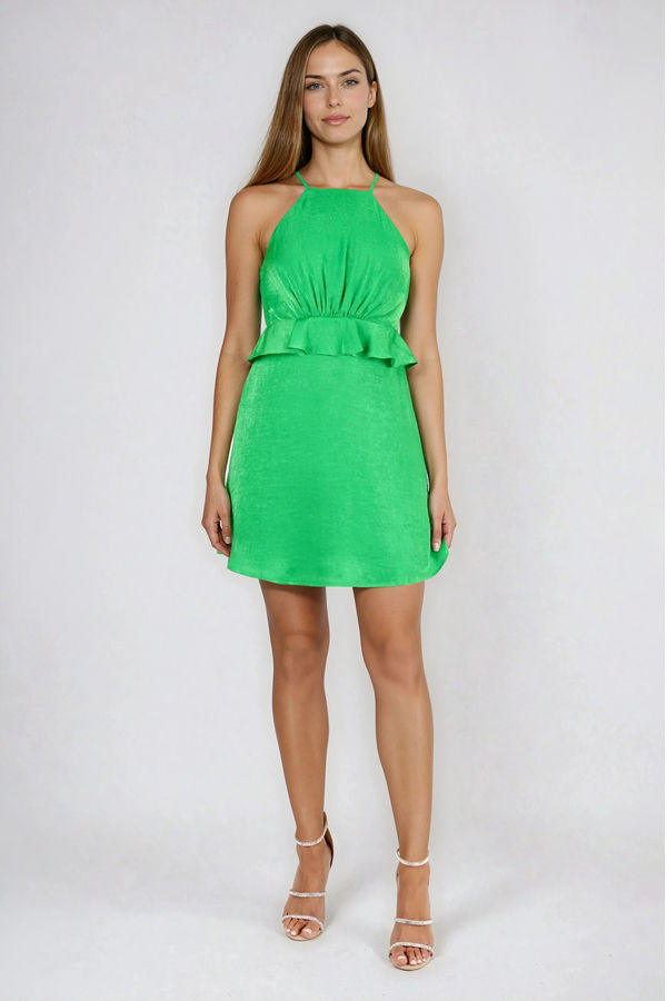 Flirty, fresh, and made to shine, Little Stunner Satin Peplum Mini Dress in Green brings instant charm with its silky sheen, flattering high neckline, and softly cinched waist finished with a playful ruffle hem. Lightweight and flowy, it moves effortlessly while keeping your look polished and fun. Perfect for brunch dates, garden parties, vacation nights, summer weddings, or cocktail hours when you want an easy statement that feels confident, feminine, and totally put-together.
