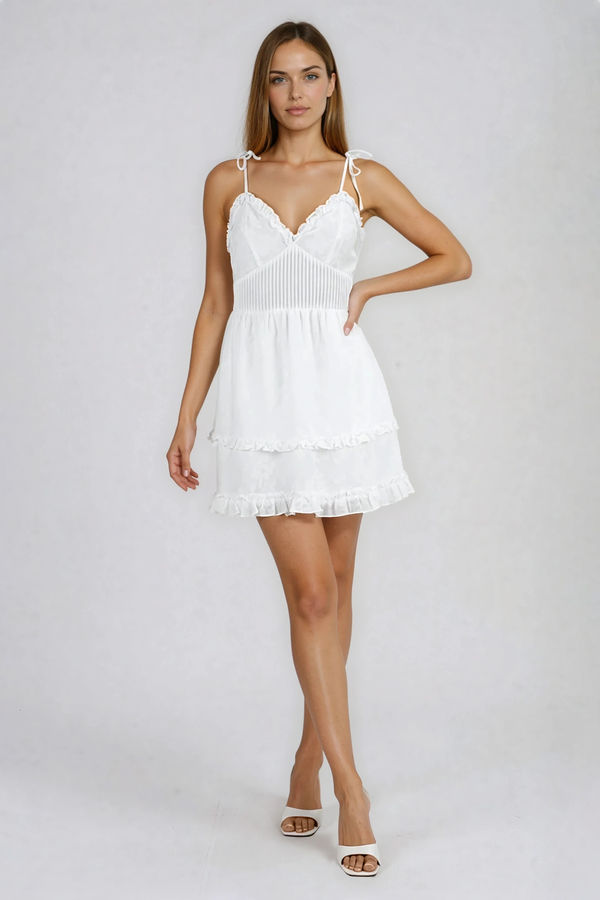 Flirty, feminine, and made to twirl, the All About the Flowers Ruffle Tie Strap Mini Dress in White brings playful romance to every look. Featuring a fitted bodice, delicate ruffle trim, adjustable tie straps, and a stretchy smocked back, it offers a flattering fit with breezy comfort. Easy and effortlessly cute, it’s perfect for brunch dates, garden parties, showers, or sunny weekend plans when fun, flirty style is the vibe.