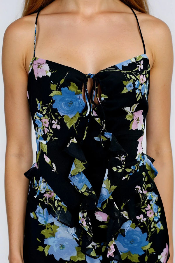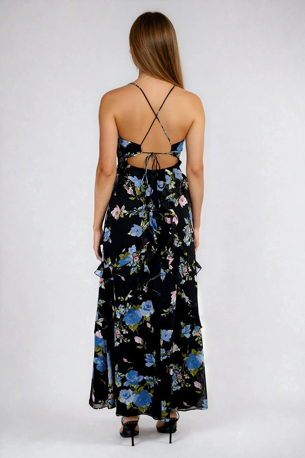 Floral Grace Ruffled Lace Up Maxi Dress - Black Blue