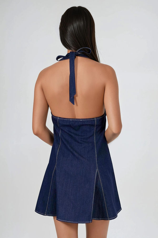After Hours Halter Denim Mini Dress - Dark Wash