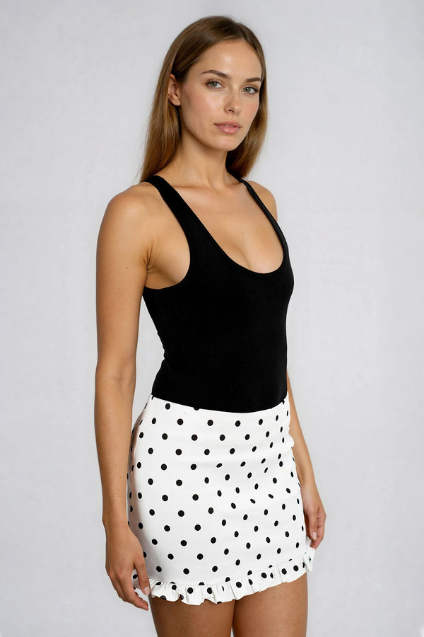Playful, flirty energy starts with the Cute on Cue Polka Dot Ruffle Mini Skirt in White Black is made to turn everyday moments into cute little main-character scenes. Designed with a smooth high-waist fit and a soft ruffle hem, it hugs just right while adding movement with every step. Perfect for brunch dates, shopping days, casual parties, or weekend strolls, this skirt pairs easily with tanks, blouses, or sweaters for endless outfit moods.