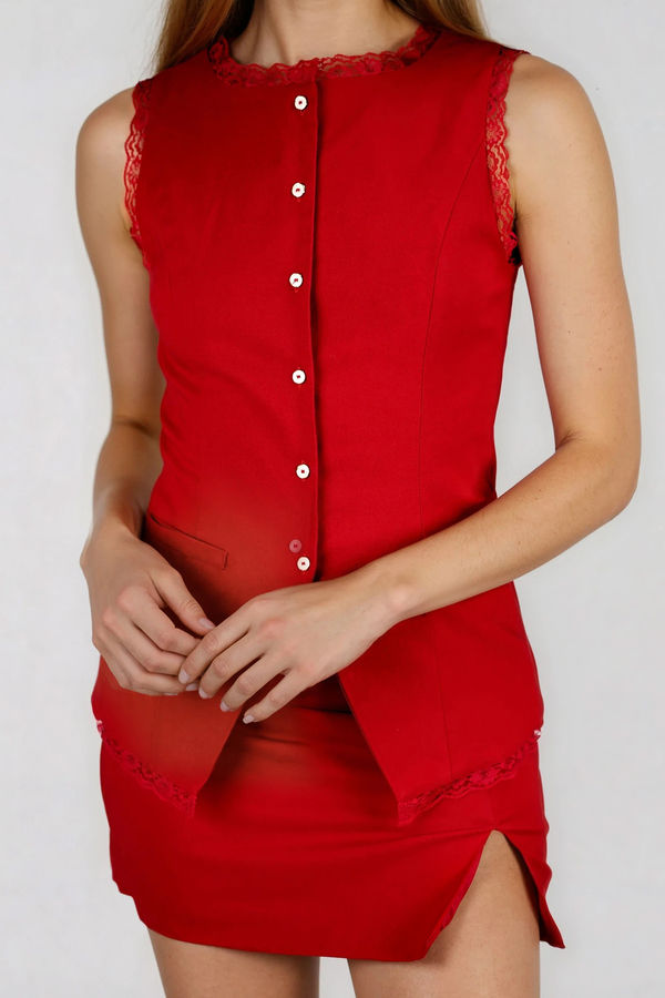 - Round neckline button down vest with lips pocket and skirt set