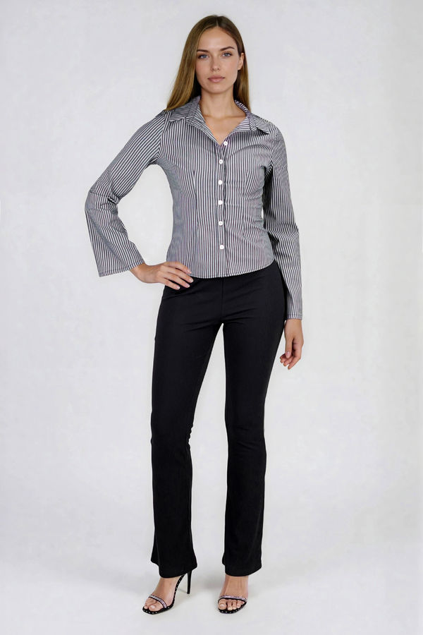 Sleek, confident Own the Day Pinstripe Long Sleeve Shirt in Washed Black sharpens any look with its tailored silhouette and crisp button-front design. Designed to contour just right, it features structured seams, elongated cuffs, and breathable fabric that moves with you. Easy to dress up or down, it pairs perfectly with trousers or denim. Ideal for office days, after-work plans, coffee meetings, or city outings when polished style is a must.